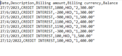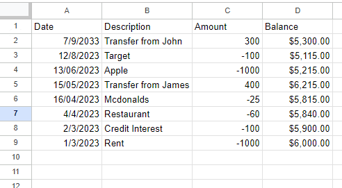 Amount | Money debited and/or credited to your account. Money flowing in is indicated as a positive and money flowing out is indicated as a negative |